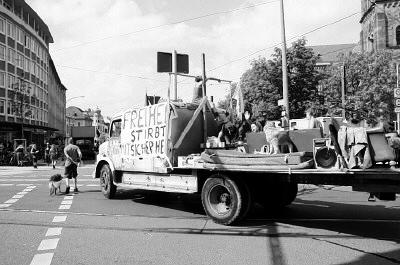 Rund 50 Wagenburgler wollten gestern Mittag ins Amt für öffentliche Ordnung eindringen. Allerdings kannten sie offenbar nicht die Gepflogenheiten eines deutschen Amts. Denn Punkt 12 Uhr schlossen sich die Pforten. Lediglich das Bürgeramt daneben an der Ecke Günterstal-/Basler Straße hatte noch offen. Als die Wägler dort hineinwollten, stellten sich ihnen einige Beamte entgegen und drängten sie wieder zur Tür raus. Anlass für die Aktion waren zwei Briefe des Ordnungsamts, in denen die Wagenburgler aufgefordert wurden, die Parkplätze an der Bötzinger Straße und dem Opfinger Baggersee bis gestern Morgen 9 Uhr zu verlassen. "Kommen Sie heraus und reden Sie mit uns", forderten die Wägler an der Basler Straße per Megaphon. Als sich nach mehr als einer Stunde kein Ordnungsamtler blicken ließ, wurde entschieden, den sonnigen Tag besser zu nutzen: "Wir wollen uns den Tag nicht versauen und fahren jetzt zum Baden an den Opfinger Baggersee." Von dort waren die Wägler am Morgen gekommen und hatten ab 10 Uhr auf dem Stühlinger Kirchplatz gefrühstückt.