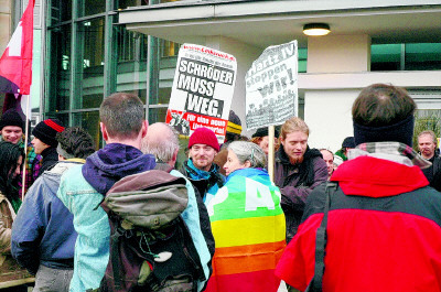 Um 11 Uhr kam es kurzzeitig zu Rangeleien am Eingang, weil sich Protestanten, die sich bis dahin mit ihren Transparenten ("Schröder muss weg!") und Fahnen nur auf dem Vorplatz aufgehalten hatten, Zutritt zur Agentur verschaffen wollten. Das verhinderte die Polizei. Es gab nach Polizeiangaben weder Verletzungen noch Beschädigungen und auch keine Verhaftungen. Personalien wurden ebenfalls nicht festgestellt. Gegen Mittag löste sich die Versammlung auf.