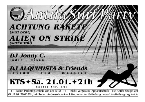 Es soll ja Menschen geben, denen Winterkälte und Schneefall eher am Arsch vorbei, oder besser gesagt, unangenehm in die Gliedmaßen fährt. Für all die, und natürlich auch für die Fans der kalten Jahreszeit, hat die Antifa Freiburg eine heiße Nacht vorbereitet. Zusammen mit den Ya Basta!s wird es schon im Januar das Surf- und Latino-Ereigniss des Jahres geben.