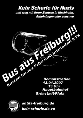 KTS und Antifa Freiburg laden ein zur antifaschistischen Busfahrt zur Demo nach Grünstadt! Tickets gibt es für 10 Euro im Infoladen der KTS (Öffnungszeiten: Di 17-19 Uhr, Do 17-20 Uhr), in der jos fritz-Buchhandlung (Öffnungszeiten: Mo bis Fr 9-19 Uhr, Sa 10-16 Uhr).