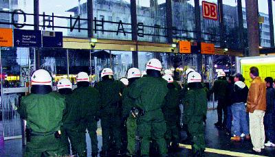 Dass sich in dieser Situation die Polizei aufs Abwarten und Beobachten beschränkte, begeisterte zwei spanische Reisende: "In Barcelona hätte die Polizei längst Knüppel sprechen lassen." Die Knüppel der äußerst zahlreichen Freiburger und Göppinger Polizeikräfte jedoch kamen an diesem Nachmittag nicht zum Einsatz. Vermutlich war es vor allem der unerbittliche Regen, der die Demo-Party vorm Hauptbahnhof kurz nach fünf vertrieb. Zuvor jedoch hagelte es ausgiebig Eier auf die Glasfront des Bahnhofs und die davor stehenden Einsatzkräfte. Mit einem Flaschenwurf ging auch eine Scheibe zu Bruch. Tags zuvor noch hatte die Punkband "Lee Majors" auf einem ungenehmigten Open Air-Konzert auf dem Augustinerplatz gesungen: "Wer einen Bahnhof aus Glas besitzt, soll nicht mit Steinen schmeißen." Nun war die Zerbrechlichkeit des Glashauses demonstriert. Man zog unter Polizeibewachung weiter zum Theater, wo die - unangemeldete - Demonstration aufgelöst wurde. "Demo und Konzert waren gut besucht", meldet die KTS-Ini, "jetzt sollten sich Bahn und Stadt dran machen und die Kündigung zurückziehen." Die Weichen wurden am Bahnhof vermutlich anders gestellt.